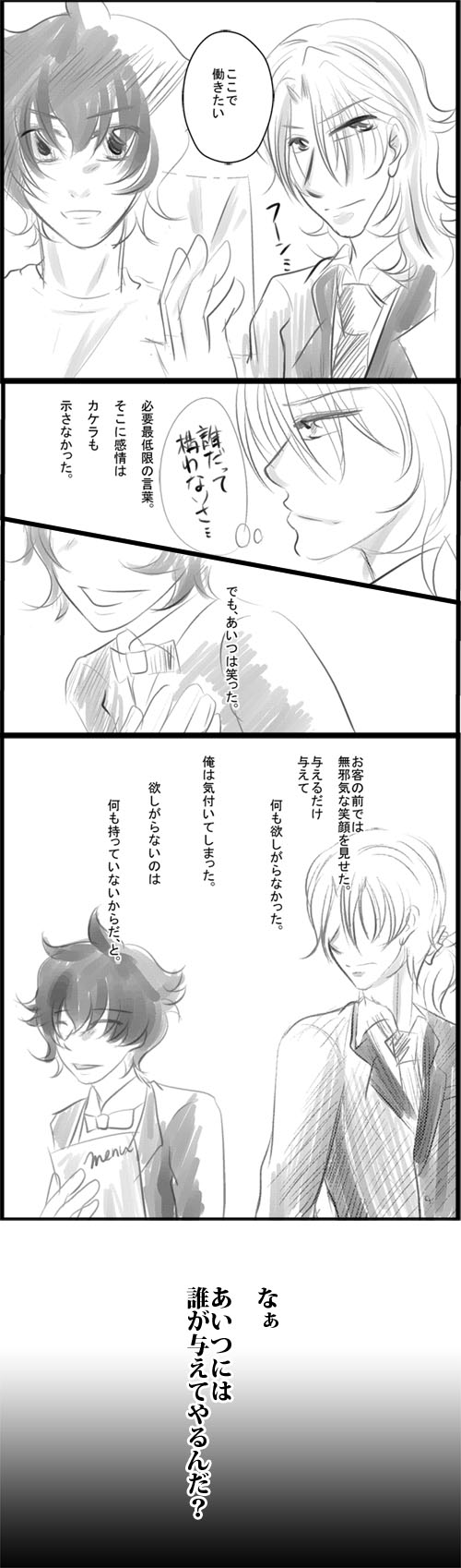 どうも、ねこです。 原稿中に 「ロックオンがスーツの話がかきたーい!!」 と燃え上がっていたんですが 妄想してみたら執事になっていました。 そんな作品はこちら↓ ロックオンが執事をする店に 雇って欲しいといってやってきた刹那という設定。 客の前では屈託なく笑うのに 店が閉まるとふっと表情をなくす。 そんな刹那を気にしているうちに 奥深くにある傷に気付いてしまったロックオン。 この店には傷をもった人間がやってくる。 深入りしない…それがこの店のルールなのに… という話みたいです。 シリアスが大好きです。下手の横好きです。 拍手ありがとうございました~! 次こそは…スーツの話を…!!(笑) 新刊情報更新済みです~2010/07/31 (Sat) - お知らせ(イベント関係も含む) どうもねこです♪