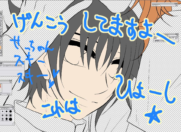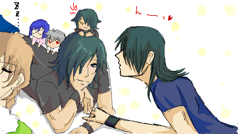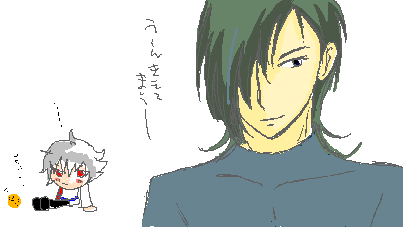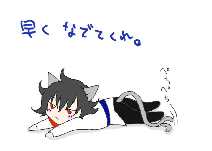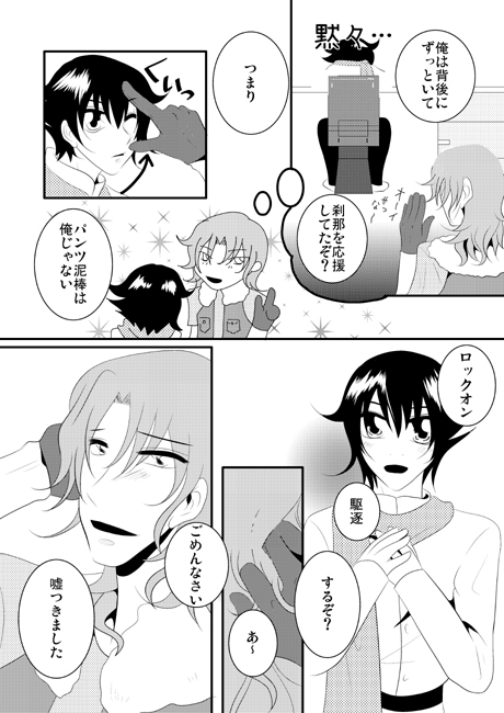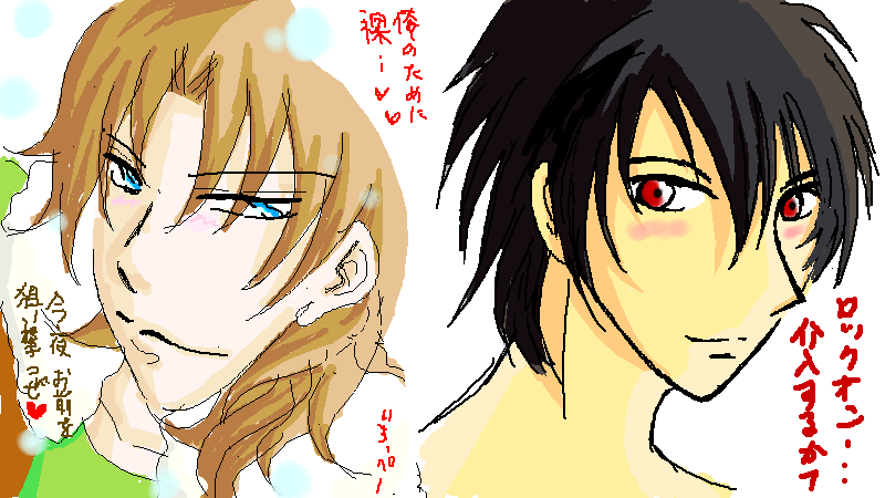 先日の絵チャしたないぁ…というつぶやきに 私でよければ付き合うぜ!と マイ女神様のふなむし帝王様がおっしゃって下さったので 即行、お願いして、絵チャしてきました~!!! 以下、絵チャログを張っておきます! ※ご本人から掲載許可を頂いてます☆ 二人を出会わせてくれた志波若をかきかき。 お互い絵チャなれてないので使い方がわからず悪戦苦闘; そして、帝王様がアレくんを描いてくれるとのことで うきうきしながら傍観♪ 画面にでかでかとアレくんが出来上がっていきます♪ その横で自由にらくがきしてるのは、もちろんわたくしw アレくん完成☆ 次は、私のロックオン…という流れでしたが 優しい帝王様が私のために(勘違い?)カッコイイ刹那を 隣にカキカキ。 せっちゃん、裸ですよね…!!?? そのあと、二人でアレハレをまさかの合作!! 私が描いた構図に帝王様があわせてくださいましたよ~ すげーvvvvv ハレルヤにちゅーを迫られるアレルヤw とりあえず、頬は染めておきましたよ(笑) 最初は絵チャの使い方がわからなくて 結構ムキーっとなってましたが 帝王様が色々発見して教えてくださったので 楽しく一枚絵を書くことができました♪ チャットもしつつ、絵も描きつつで 充実した絵チャでした~☆ 帝王様、遅くまでお付き合い頂き 本当にありがとうございました♪ そういえば、ほとんどエロトークしませんでしたね(笑)次回は!w また、どこかの絵チャにおじゃましたり このブログで獲物探しをしたりすると思いますが よろしくお願いしまーす(笑) 4月22日、 4月25日、 拍手ありがとうございました♪ 今週もう一本くらいニル刹漫画公開したいと思ってますので また見に来ていただけると嬉しいです♪ おひさしぶりです。ねこでございます。恒例、新刊パロ。また…パンツかよ…w いけそうな気がする。自分の原稿でさらに妄想するので、たちが悪い。
