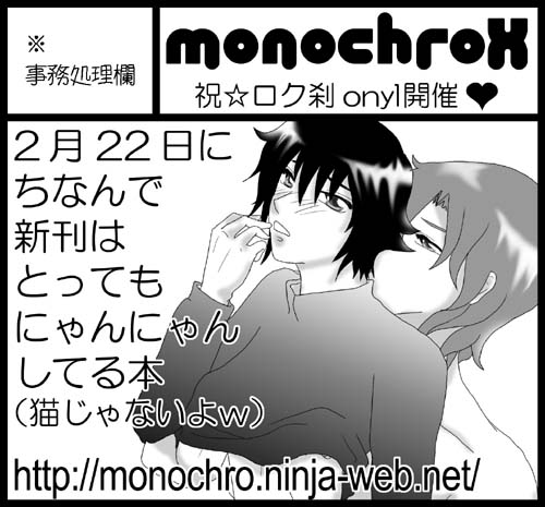 どうも、ねこです。 イベント続きで随分溜めていた アニメ感想短めで書いていこうと思います~♪ スタートは第15話! 刹那いたそう… 2期は刹那とティエ様が意外と仲良し風で なんだか和む。 ニールがヤキモチちゃいちゃうぞ☆ コーラw 恋の手ほどきお願いしたいよ!! つか、自分はマネキンさんとどうなのよw ちっこい刹那と大きい刹那の夢の共演ー!!! そして ニールさぁぁぁぁぁん!! 刹那はニールを心の支えにしてくれている、のかな。 ニールに言ってほしかった、背中を押してほしかった そう、思いたいなぁ。 あぁ…上半身…いいからだ ←やましい 以上、感想!(しまりがない…w) ロク刹オンリーお疲れ様でしたvvvどうも、ねこです。 やっと自宅に帰ってまいりました~ 2/22 ロク刹オンリーお疲れ様でした!! 当サークルの発行物を見てくださった方、 お買い上げくださった方、 ありがとうございました!! さらなる萌本を作るべく、全力で頑張りますので 今後もよろしくお願いいたしますm(_ _)m 今回のオンリーは参加スペース数約150、とのことでしたが 実際会場にはいってみて改めて感動! こっこれが全部ロク刹好きさん…!!! 事前にチェックした本たちは全入手しましたが 全然時間たりなかった! 会場でもっと見たかった!!! オンリーってなんて素晴らしいんでしょ(泣) オンリーあわせ新刊もたくさんありました。 参加されたサークルさん全てに、心より感謝を伝えてたいです!! そして、お隣のスペースの方は スケブで忙しかったのにお話相手をしてくださったって楽しい時間でした♪ もっとロク刹トークしておけばよかった >< なにより、なにより オンリーとても快適にく混乱なく開催・運営してもらえて オンリーを主催してくださった方々に感謝の気持ちでいっぱいです。 ロク刹好きが集まる素敵な場所を作ってくださって ありがとうございました! あーもうなんていうか、 本当に本当に、楽しいオンリーでした!!! 今でも感動で涙が出ますよ…ホロリ… 初めて現地へ前日入りしてお泊りしたり 夜通し変ロク刹会の方々との部活動wしたりと オンリー前後も本当に楽しかったです! 変ロク刹部の活動成果はそのうち ある形になってあらわれると思いますので乞うご期待です☆ オンリー前後のお話(京都観光とか~鹿とか~w)は きっと二未さんがしてくれると思うので私は割愛します! (投げたんじゃないよ!二未さんはこういうの書くのとても上手だから!適材適所!w) 次はHARUコミです! 実は新刊なしの予定だったのですが、 素晴らしいロク刹オンリーに参加して触発されました! 新刊、出します! 私にできることは萌を形にすること! オンのほうもアニメ感想漫画とか順次公開しますのでよろしくお願いします! 2月17日、 2月18日、 2月21日、 拍手おくって下さってありがとうございます~! 最近オンの更新が少なかったので 久々に作品公開頑張ります~! またお越しいただけると嬉しいです♪ 以下、拍手お返事☆ 2/22 ロク刹オンリー☆ |