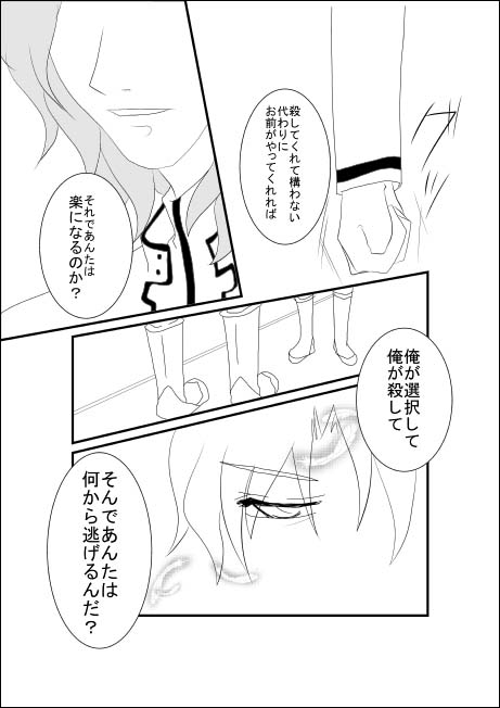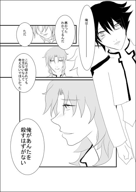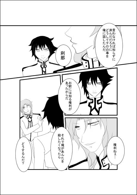 なので下においときましたw レッツ、アニメ感想↓ ギッチョンさーんw これ、彼の決めセリフになったんすか?w せっちゃんキレたー!!! せっちゃんが貴様っていった! ニールのためにせっちゃんがキレタよー!! ティエも怒ったー! ニールは皆に愛されてるなぁ… アリーは戦闘なれしてるなぁ。 マイスターって実際どうなんだろ。強いのかな? 1期は機体の性能差みたいのがあったけど 今はどこもいい機体だしねぇ。 ライル、兄さんの敵に気付いた! もーイノベータは女なのか 男なのか全体的にはっきりしてほしいですw アンドレイはどんだけルイスに心奪われてるんですか。 今日の感想。 「可憐なドレスが似合う少女」 正直w ライルのターンきたぁ!! 詳しく聞かせてくれ。 君もライセンスもちですかw ライセンスってアローズ公認単語?? しかも ライセンス = ワンマンアーミアーw ニールはすごく人間が好きなんだぁと思ったライルの発言。 ライルの複雑な表情が印象的。 ここにはいない人を思い出したからか、ニールへの劣等感か… 過去の映像にはホントにライルがでてないなぁ… この頃から何かあるのかしら? 過去が消えないから伝えないといけない人がいる。 ライルが刹那に対していった言葉が 刹那のなかでどう響いたかわからないけど、 せっちゃんには前を向いていてほしいよ。 アングルが引きでちょっとがっかりと思っていたら そのままティエの心情シーンに移ってしまったΣ(・△・) びっくりするぐらいライ刹は描かれないんですね。 おかげで、脳内妄想が活発なわけですがw グラハ、じゃなくてミスターブシドーきたー!!! ビリー言い直したー!!w 2人が揃うといい雰囲気ですね。 あんなに浮いてたブシドーも和んでる感、というか。 ブシドー様がいうと、なんでも相手が女性風に聞こえます。 わたし色wビリーも染まりたいよきっとw 合点承知!! 絶対この日のために練習したんだ! ビリーは練習したんだよ!!!! はずっっっっかっっしw ブシドー様は心眼もお持ちで。 あーもー カッコよすぎるよ!! あ、コーラくんいる♪ ハローw あ、今日もさよならコーラくーんw スメラギさん、過去回想より。 ビリーださいw アローズとイノベータの関係はなんだろう? イノベータとして後ろで控えているひとの 髪型がこれまた微妙ー!!!! 楽しみすぎるんですがw 以上、アニメ感想☆ 予告通りの感想はライ刹漫画(全4P)でっす☆ (拍手御礼は漫画の下です><) ライ刹、どうですか? 感想とかあればお聞かせ下さい♪ 12月1日に拍手くださった方、ありがとうございました~♪ 久々に漫画あげたので読んでいただけると嬉しいです☆ 以下、拍手お返事☆ DOUBLE ATTACK 3お疲れ様でした☆どうも、ねこです。 本日は、ダブルアタックお疲れ様でした! スペースにお寄り下さった方、 本を手にとって下さった方、 ありがとうございました☆ 全国大会の後、ということもありまったり雰囲気でしたね~♪ 前回と違い、コスプレイヤーの方がいらっしゃったので 目の前を通過する度にドキドキしながら凝視してましたw やはり、華やかでいいですね◎ 初ガンダムOO、初オンリーとでかなり緊張しましたが お隣さんもとても気さくな方でしたし、 変ロク刹会の方もいらっしゃって楽しいイベントでした! 次の直参イベントは1/11 大阪です。 冬コミで委託とかお願いしたいけど もにゃもにゃしている今日この頃です。 11月26日、 11月28日と拍手送ってくださってありがとうございました♪ 次のイベントまで多少時間があるので サイトに漫画を上げれるようがんばります~ 以下、拍手お返事☆ パーフェクトミッションファンブックに色々つっこみたい。マジで。16歳と21歳、初の共演w