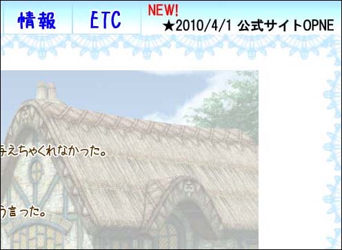 せっちゃんの家出(笑) どうも、ねこです。 短い間ではございましたが、 エイプリルフールネタにお付き合いありがとうございました♪ しょぼいながらも一生懸命作ったので 後日サイトで公開できたらと思っています。 まぁ、すでに原稿に追われているので ちょっと先の話になりそうですが。 今年も個人・企業かかわらず エイプリルフールネタのサイトが溢れてて楽しかったです! 実は、サイトでエイプリルフール祭りを始めたのは ある同人サークルさんのサイトに出会ってからです。 読み専のファンとして追いかけている 別ジャンルの方なんですが その方が、すごく仕事が丁寧で。 4月1日のためにそれは素晴らしい萌ネタを 公開してくれるんです。 今年も、すごかった!萌もあるし芸が細かいw 一日のために質のよい作品を作り上げられる所、 ホント尊敬しています。 私が毎年驚きと萌を頂いているように うちのサイトを見てくださった方に驚きと萌を 感じてもらえるといいな、って思ってます。 とりあえず、また来年も楽しくしたいっす! 元々ゲームっ子なんで いつかゲームは作りたいですね。 ちいさな夢であります。 拍手ありがとうございました~! エイプリルフールネタで拍手をいただけて嬉しいです♪ コメントもありがとうございました!! PR 以下、拍手お返事☆ サイトのエイプリルフール仕様について2010/04/01 (Thu) - お知らせ(イベント関係も含む) サイトを全面的に変更しました。