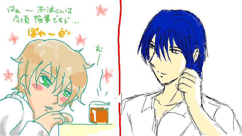 先日の絵チャしたないぁ…というつぶやきに 私でよければ付き合うぜ!と マイ女神様のふなむし帝王様がおっしゃって下さったので 即行、お願いして、絵チャしてきました~!!! 以下、絵チャログを張っておきます! ※ご本人から掲載許可を頂いてます☆ 二人を出会わせてくれた志波若をかきかき。 お互い絵チャなれてないので使い方がわからず悪戦苦闘; そして、帝王様がアレくんを描いてくれるとのことで うきうきしながら傍観♪ 画面にでかでかとアレくんが出来上がっていきます♪ その横で自由にらくがきしてるのは、もちろんわたくしw アレくん完成☆ 次は、私のロックオン…という流れでしたが 優しい帝王様が私のために(勘違い?)カッコイイ刹那を 隣にカキカキ。 せっちゃん、裸ですよね…!!?? そのあと、二人でアレハレをまさかの合作!! 私が描いた構図に帝王様があわせてくださいましたよ~ すげーvvvvv ハレルヤにちゅーを迫られるアレルヤw とりあえず、頬は染めておきましたよ(笑) 最初は絵チャの使い方がわからなくて 結構ムキーっとなってましたが 帝王様が色々発見して教えてくださったので 楽しく一枚絵を書くことができました♪ チャットもしつつ、絵も描きつつで 充実した絵チャでした~☆ 帝王様、遅くまでお付き合い頂き 本当にありがとうございました♪ そういえば、ほとんどエロトークしませんでしたね(笑)次回は!w また、どこかの絵チャにおじゃましたり このブログで獲物探しをしたりすると思いますが よろしくお願いしまーす(笑) 4月22日、 4月25日、 拍手ありがとうございました♪ 今週もう一本くらいニル刹漫画公開したいと思ってますので また見に来ていただけると嬉しいです♪ PR |